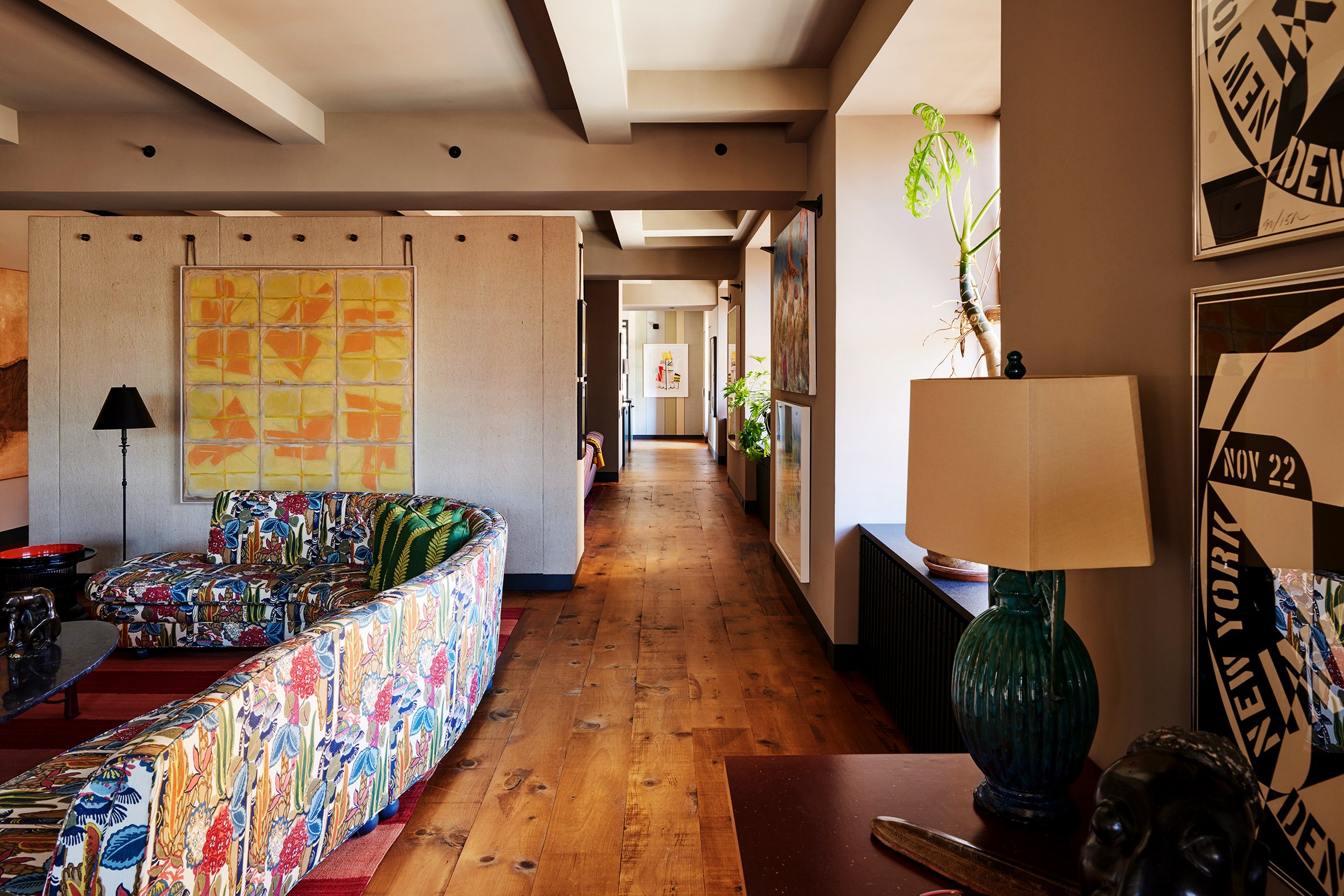 Set in a historic Chelsea factory building, this Manhattan loft spans 6,000 square feet, with broad windows and an auxiliary studio apartment incorporated into the generous floor plan. Every room is a careful and imaginative curation. The library is a central feature, with both built-in and floating bookcases. An open kitchen adjoins with a lounging area room, both bathed in natural light.